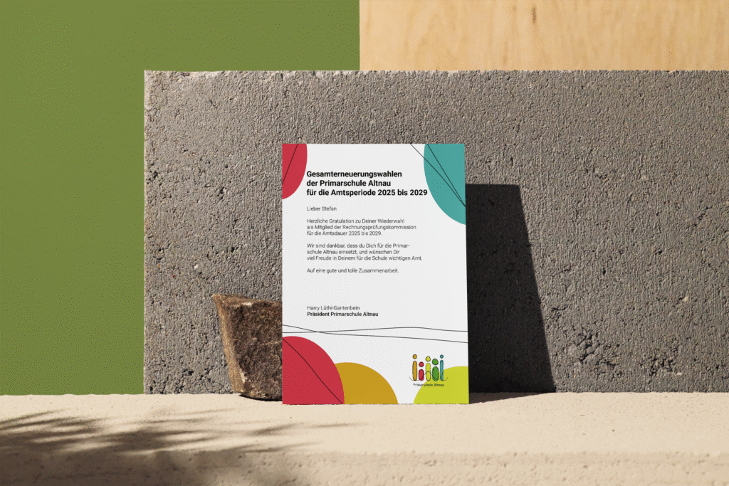 Für dieses Projekt durften wir für die Primarschule Altnau Karten gestalten, mit denen wir den jeweiligen Personen zur Wiederwahl oder Wahl ihrer Position gratulieren konnten. Bei der Gestaltung hatten wir viel Freiheit, mussten nur den vorgegebenen Text verwenden und die Karten auf maximal A5-Grösse halten. Zusätzlich sollte das Design gut zur Schule passen.